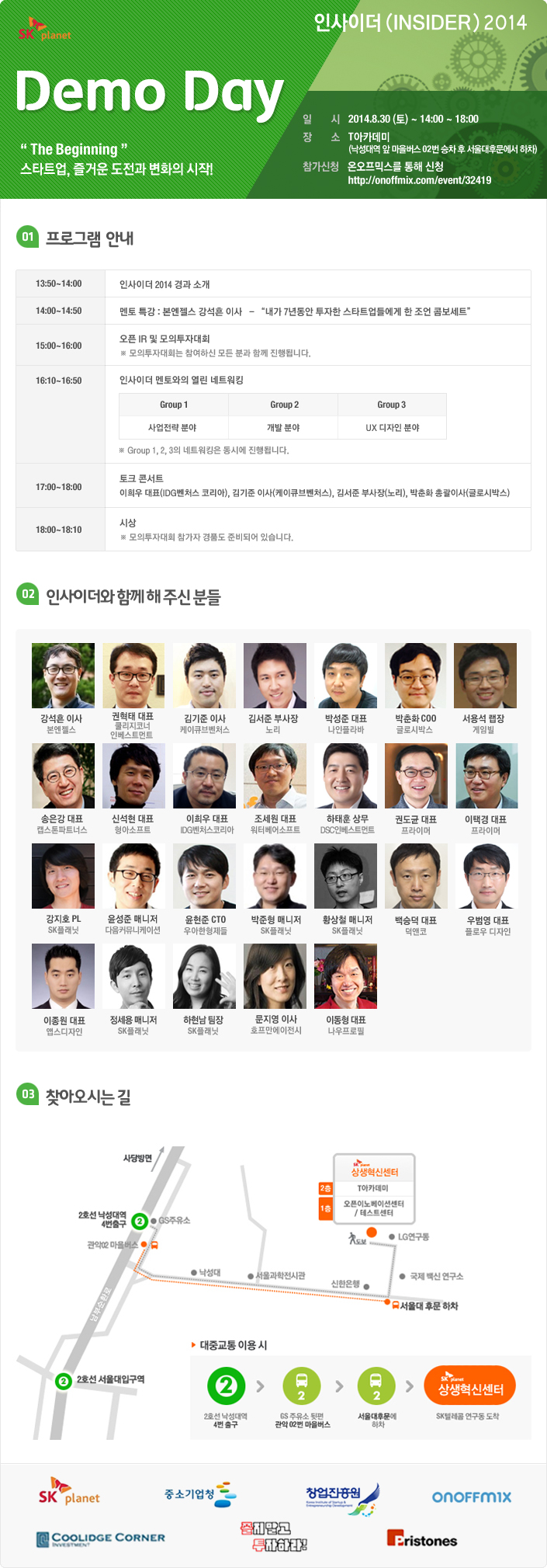 SK플래닛은 예비창업자와 초기 스타트업을 지원하기 위한 교육 및 멘토링을 제공하는 ‘인사이더(Insider) 2014′의 데모데이를 오는 30일에 개최한다.