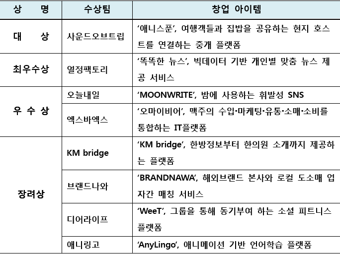 대상의 영예를 차지한 ‘사운드오브트립’ 팀은 한국중국일본 동아시아 및 한자문화권 지역을 타깃으로 현지의 일반 가정식 식사 체험을 제공하는 서비스 ‘애니스푼’으로 심사위원들로부터 최고점을 받았다. 최우수상에는 ‘열정팩토리’ 팀이, 우수상에는 ‘오늘내일’ 팀과 ‘엑스바엑스’ 팀 등 총 2팀이 선정됐다. 이 밖에 4개 팀이 장려상을 수상했다.