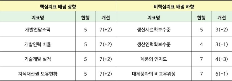 또한 현행 평가항목별 혁신성 측정의 우선순위를 재검토하여 핵심지표의 배점은 상향 조정하고 비핵심 지표의 배점은 하향 조정하였으며, 기술성 중심의 평가를 위해 기술의 우수성 항목의 배점을 대폭 확대(7점→18점)하고, 해외 시장진출 역량을 갖춘 기업이 평가에 유리하도록 ‘글로벌 시장 진출가능성 항목’(5점)을 신설하였습니다. 이에 따라 평가항목중 기술성 분야의 총 배점이 당초 43점에서 52점으로 9점 증가하였습니다.
