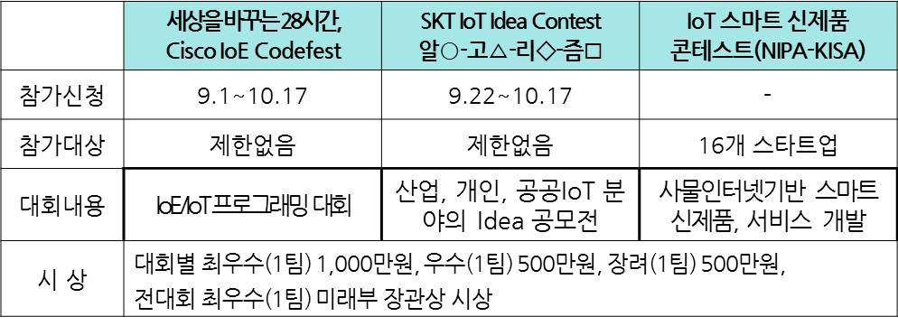 사물인터넷글로벌 협의체에 참여하고 있는 SKT와 시스코는 이번 대회 입상자들에게 상금과 함께 서비스 개발지원 및 사업화 지원 등의 특전을 제공하고, 정보통신산업진흥원-한국인터넷진흥원은「교육연계형 사물인터넷 스마트 신제품 개발지원」프로그램을 통해 발굴‧지원한 우수사례에 대해 포상한다.