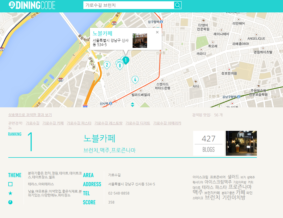 예를 들어보면, 가로수길 브런치라고 검색해보자. 위에서 볼 수 있다시피 427개의 블로그에서 노블까페(간접광고 아닙니다)를 포스팅했다. 포스팅 된 글의 키워드는 브런치, 맥주 그리고 프로즌나마다. 마찬가지로 분석을 통해 도출된 키워드다. 블로그들에서 공통적으로 추출되는 분위기 좋은, 데이트, 데이트 코스 등의 테마 또한 화면에 표시된다.