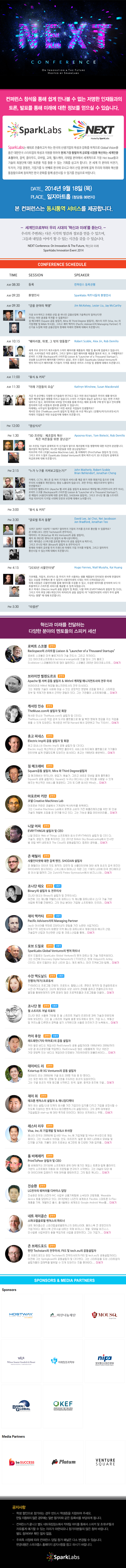매년 글로벌 IT 리더들을 초청하여 NEXT컨퍼런스를 진행하고 있는 스파크랩스는 해외로 진출하고자 하는 한국 스타트업에 투자하고 육성하는 글로벌 엑셀러레이터이다. 글로벌 비전을 품은 한국 스타트업 및 IT 업계 종사자들이 NEXT 컨퍼런스를 통해서 빠르게 변하고 있는 글로벌 트렌드 및 미래와 혁신에 대해 통찰할 수 있는 기회가 되길 바란다고 전했다.
