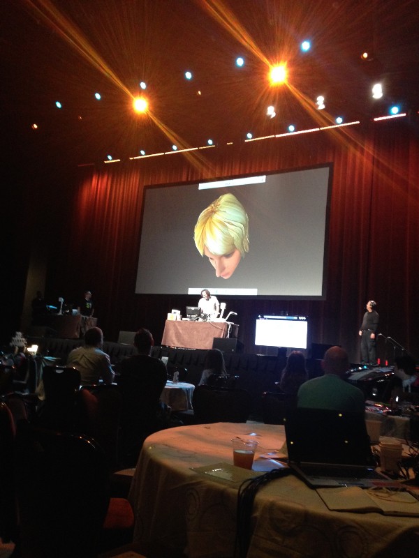이제 우리 차례가 되어 메인 단상 옆으로 이동했고, 그곳에서 마지막 데모 연습을 확인하였다. 앞에서 보니 생각보다 많은 사람들이 있어서 조금은 떨리는 마음으로 단상에 올라가서 프리젠테이션을 시작하게 되었다. Anand는 발표 진행을 맡고, 나는 카메라와 연동된 스캐너로 기기를 제어하여 시연을 보조할 것이다.