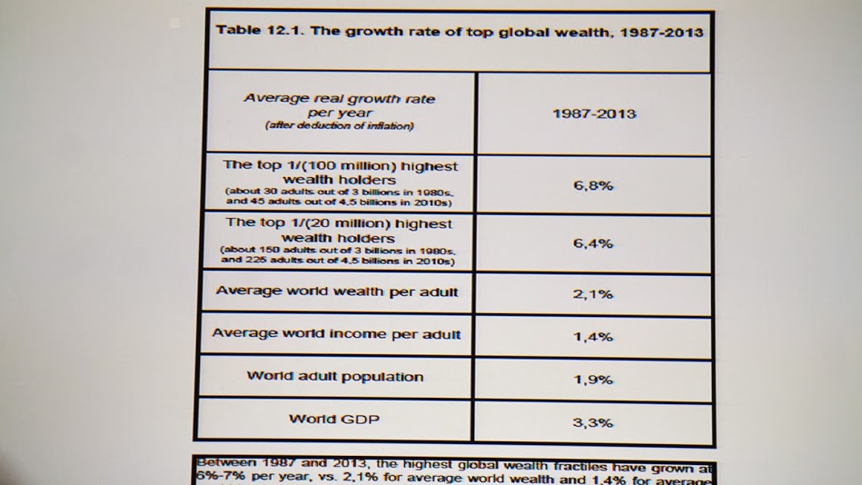 최상위 계층의 부는 계속해서 증가하고 있다. 포브스의 자료를 바탕으로 억만장자 데이터를 살펴봤다. 수는 계속 증가할 수 밖에 없다. 새로 등장하고 빠지는 억만장자의 평균치를 봤을 때 그들 부의 성장률은 6.8%대… 이때 세계 경제성장률은 3.3%. 세계 인구 수의 변화와도 연관이 있다. 세계 부의 증가률은 2.1%…세계 인구 소득 증가율은 1.4%성장을 위해서 불평등을 감수해야 한다는건 안다. 지금의 불평등은 중산층에게까지도 미치고 있다. 미국의 경우 중산층의 비중은 전체 소득의 20~23%밖에 안된다. 한세대 전만 해도 30%.