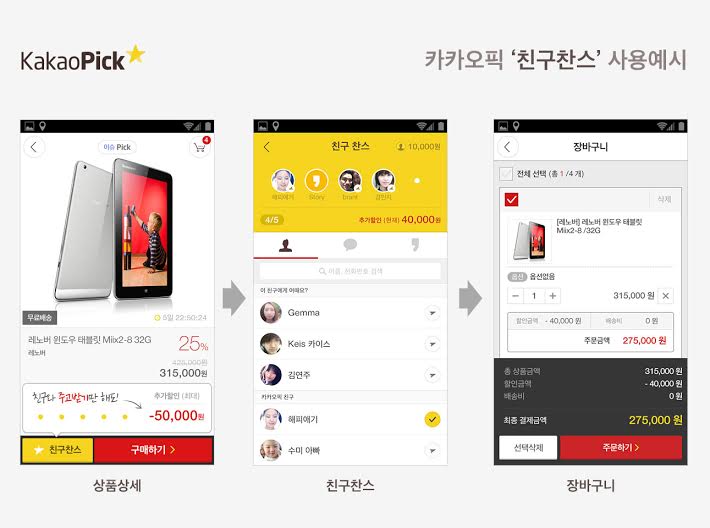 카카오픽의 가장 큰 특징은 바로 ‘친구찬스’ 기능이다. 서로의 취향을 잘 아는 친구들끼리 카카오톡이나 카카오스토리로 쇼핑 정보를 공유하면 가격 할인 폭을 높일 수있다. 카카오픽이 기본적으로 제안하는 특가에서, 친구 한 명에게 추천할 때마다 일정 금액만큼 추가 할인을 받는 방식이다. 상품에 따라 최대 3~5명의 친구와 공유할 수 있으며, 추천한 사람이나 추천받은 사람 모두 동일한 할인 혜택을 누릴 수 있다. 카카오픽은 합리적인 쇼핑 기회를 제공하고, 소비자가 자발적으로 정보를 공유하는 입소문 효과를 통해 막대한 광고비를 절감, 이를 소비자에게 가격 혜택으로 돌려주는 선순환 방식으로 서비스 경쟁력을 높여나갈 방침이다.