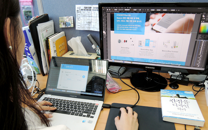 스타트업 위크엔드에 연인이 나란히 함께 참가해서 베스트엔지니어링상을 수상한 팀이 있다고 하여 경기도 안양시로 향했다. 이종민 대표는 올해 6월 ‘카이노스데이즈‘라는 법인 회사를 설립하였고 이번달 17일에 그들의 첫 작품, ‘비콘보이(Beacon Boy)’를 세상에 선보였다. 한편 조정연 디자이너는 ‘BYOM’이라는 회사를 설립하여 O2O 시장에 도전하고 있다.