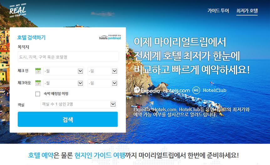 온라인 맞춤 여행서비스 전문 기업 마이리얼트립이 전세계 호텔 검색 서비스 호텔스컴바인과 제휴를 맺고 전세계 호텔 최저가 가격비교 서비스를 새롭게 오픈했다.
