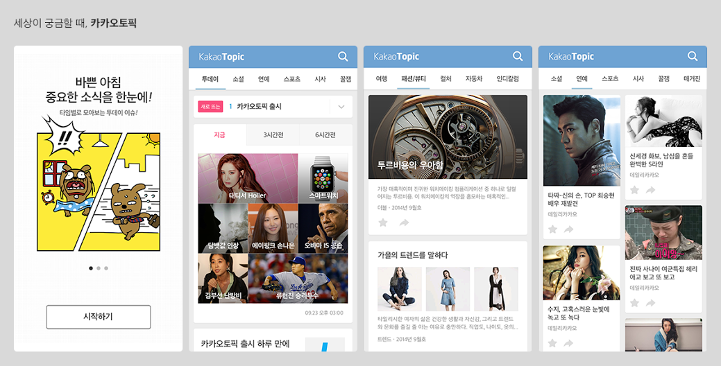 카카오토픽은 현재 가장 화제가 되고 있는 이슈부터 패션/뷰티, 유머, 여행 등 다양한 분야의 콘텐츠들을 개인 관심사에 맞게 추천해주고, 지인간 공유도 할 수 있는 콘텐츠 추천 서비스 애플리케이션(앱)이다.