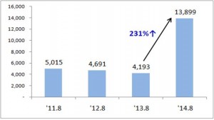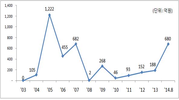 투자(억원) : (‘00)20,211→(‘01)8,913→(‘12)12,333→(‘13)13,845→(‘14.1-8)9,439