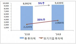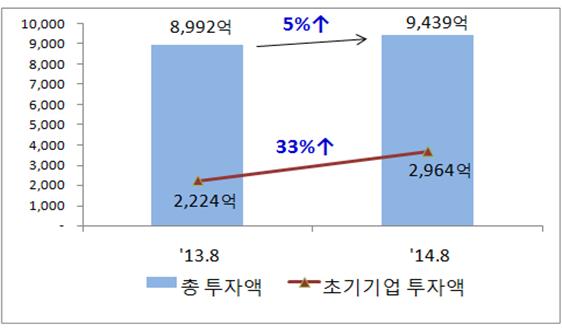 신규 벤처투자도 증가했습니다. 금년 1~8월간에도 총 9,439억원으로 전년 동기(8,992억원) 대비 5% 증가하였습니다. ‘14.1~8월간 실적은 ’00년 이후 최고치를 기록한 ‘13년 신규 투자(1조 3,845억원)과 비교한 증가율이기 때문에 매우 양호한 신규투자 실적입니다.