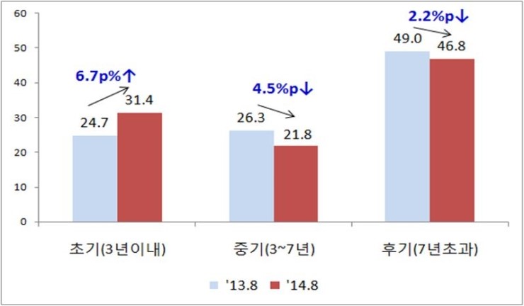 < 신규투자 추이(‘13.8 vs. ‘14.8) > < 초기투자 비중(‘13.8 vs. ‘14.8) >