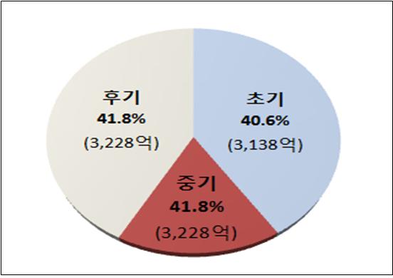 특히, 창업초기 투자비중이 늘어난 것에는 시장실패를 보완하는 임무가 부여된 모태펀드의 역할이 컸습니다. 모태펀드가 조금이라도 출자한 벤처펀드들의 초기기업 투자비중은 금액기준으로 40.6%, 업체수 기준으로 58.0%(282개)나 차지하여 초기투자 증가에 결정적 역할을 했습니다.