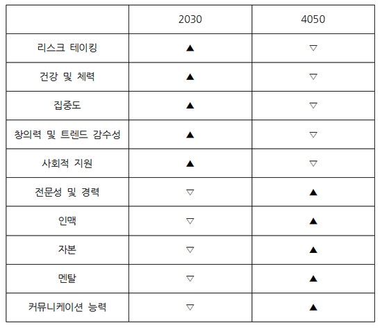 “인적 네트워크도 무시 못하지. 2030이 아는 사람이 적어 말 그대로 맨땅에 해딩할 때가 많다면 4050은 다양한 비즈니스 파트너를 보유하고 있다는 것”
