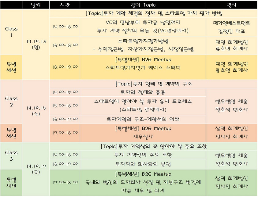 투자교육은 ‘스타트업 펀딩-투자계약 프로세스’를 주제로 진행된다. 주요내용은 ▲투자 계약 체결의 절차 및 스타트업 가치평가 방법 ▲투자 형태 및 계약구조 ▲투자 계약상 꼭 알아야 한 주요조항 등이다. 강사로는 김정민 메가인베스트먼트 대표, 류호연 대명 회계법인 회계사, 정호석 법무법인 세움 변호사, 전세진 삼덕 회계법인 회계사 등이 나선다.
