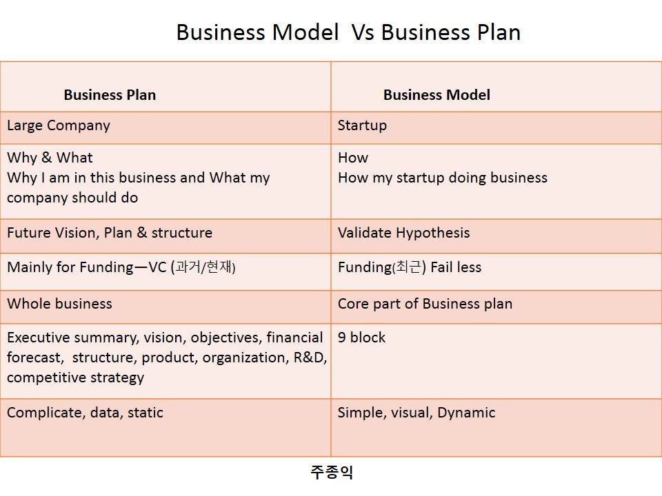 사실 말은 간단 하지만 Business Plan에서 다루는 모든 점을 문서로 작성은 하지 않지만 Business Plan을 작성할 때 고려 하는 사항을 머리 속으로는 모두 고려한 후에 작성할 수밖에 없다. 따라서 Business Model을 만드는 것도 그리 간단치는 않지만 Business Plan 보다는 훨씬 쉽다. 사전에 전체를 생각해보지 않고 Business Model을 만들면 진행과정에서 많은 문제점에 부닥치게 된다.