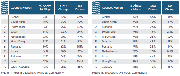 최근에는 큰 의미가 없긴 하지만 4Mbps 이상의 “나름” 고속 인터넷 접속 환경에 대한 데이터도 한번 살펴볼만합니다. 유럽을 비롯하여 중동의 국가들이 전년동기 대비하여 두자릿수 이상의 상승을 하고 있다는 점이 무척 인상적입니다. 전세계적으로는 여전히 59% 의 사용자만이 4Mbps 이상의 속도를 이용하고 있어 인터넷 접속 속도 관점에서 간극이 여전히 크다는 것도 데이터가 이야기 해주는 듯 합니다.