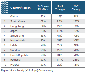한국은 4K Readyness 를 위한 인터넷 환경에 대해서도 전체 사용자의 62% 가 충분한 속도를 사용하고 있다고 합니다. 4K 급의 영상을 소화할 만한 컨텐츠 시장이 있느냐하는 질문이 있을 수 있겠지만 그런 시장 상황과 별개로 인터넷 환경 관점에서는 가장 많은 준비가 되어 있다라고 이해할 수 있을 것 같습니다.