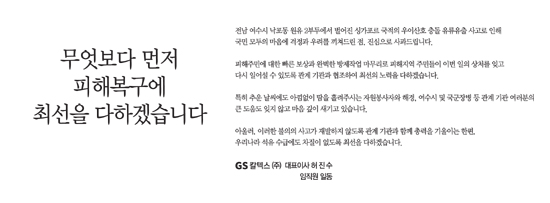 여러 논란들이 많지만 현 상황에서 GS칼텍스가 가장 중요하게 생각하는 것은 바로 ‘피해복구’라는 점을 강조한 것이다. 그 뒤 “전남 여수시 낙포동 원유 2부두에서 벌어진 싱가포르 국적의 우이산호 충돌 유류유출 사고로 인해 국민 모두의 마음에 걱정과 우려를 끼쳐드린 점, 진심으로 사과 드립니다”고 사과를 적었다.