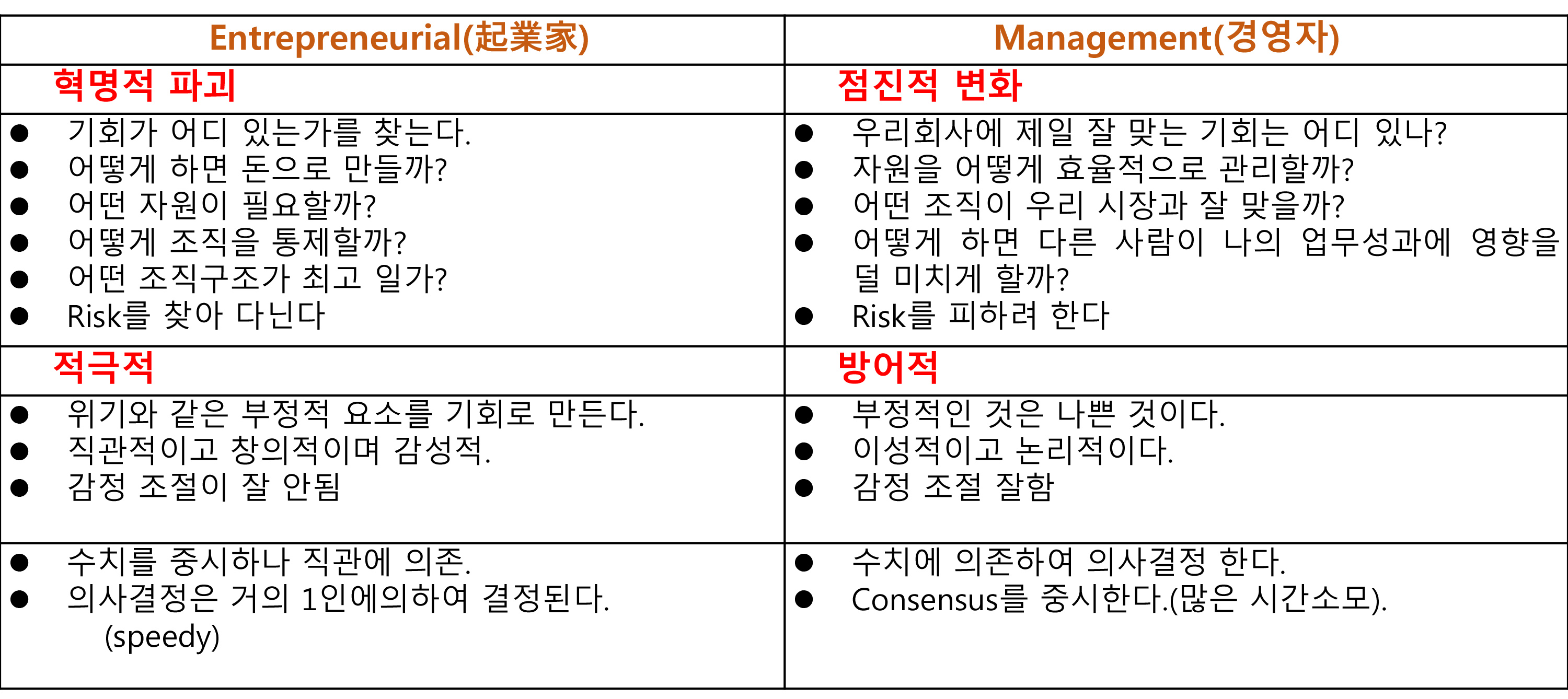 그냥 여러 자료를 요약 편집해서 표로 만들었다.Entrepreneur의 핵심은 Innovative Destruction(혁명적 파괴) 이다. 보통 기업의 경영자는 가능한 한 다가오는 Risk(어려움)를 피해가려 한다. 안정 속에서 점진적 개혁을 원한다. 뒤집어 업는 것은 질색이다. 바보처럼 부딪혀 싸우다 넘어지기를 원하지 않는다. 유능한 경영자는 이것을 잘하는 사람이다.