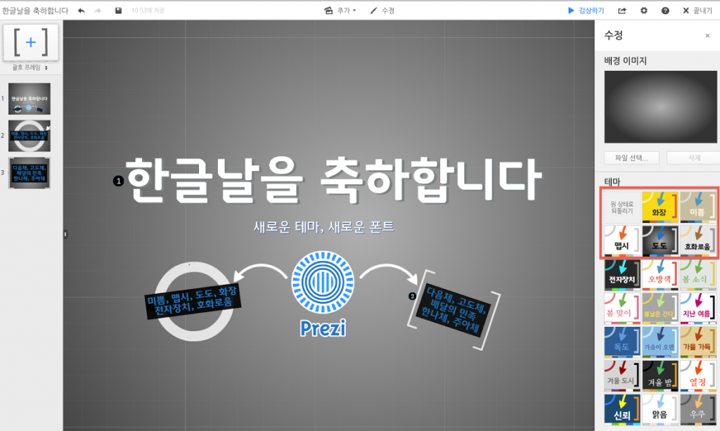 클라우드 기반의 차세대 프레젠테이션 소프트웨어 프레지(Prezi)가 신규 한글 테마와 폰트를 공개했다.