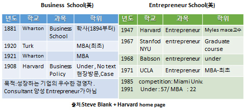 1881년 Wharton business school이 최초 개설 되었고1908년 하버드에도 MBA코스가 개설 되는 등 체계적인 경영학 교육을 받는 인재들을 양성하기 위한 많은 노력이 경주 되었다. 그러나 이 당시의 교육은 오늘 날의 startup교육과는 달리 어떻게 회사를 효율적이고 효과적으로 경영할 것인가가 주요 관심사였다.