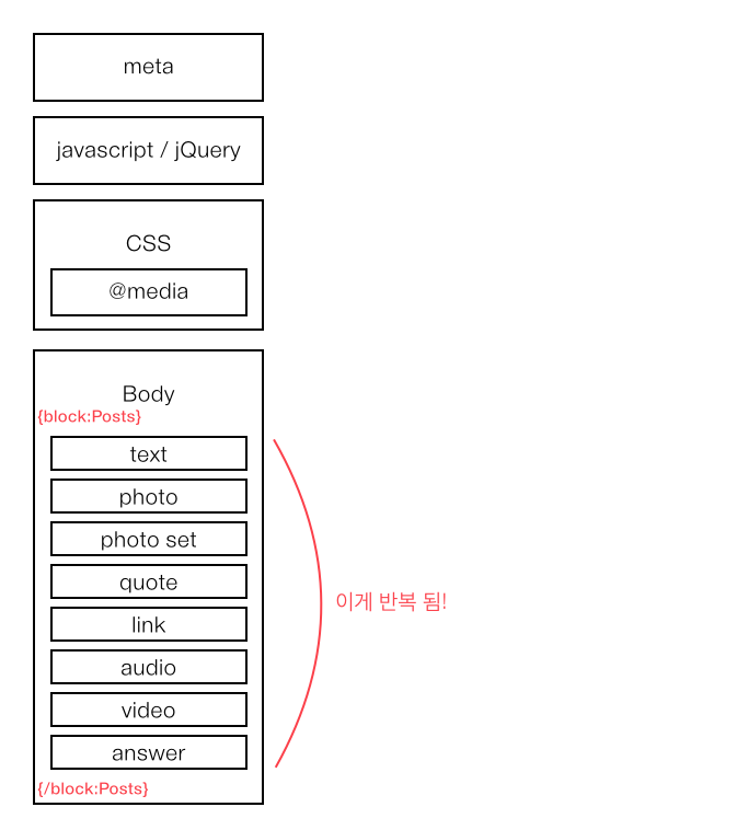 여기가 텀블러의 실제 컨텐츠가 들어가는 부분이다. 텀블러에서 지정할 수 있는 다양한 타입의 컨텐츠별로 틀이 있고, 사용자가 컨텐츠를 작성하면 그 부분에 맞춰 반복해 보여주기만 한다. 붕어빵 틀이라고 보면 된다. (설명하다보니 뭔가 객체같은 느낌적 느낌)