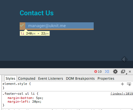 이제 어느정도 구조를 이해했으면, 눈에 거슬리는 녀석들만 잡아주면 된다. 크롬에서는 ‘보기 > 개발자 정보 > 개발자도구(opt+cmd+i)’로 볼 수 있다. 1. 돋보기를 대고 2. 고치고 싶은 곳을 찍어서 3. css 패널에서 수정해본다. 4. 맘에 들때까지 바꿔보고, 최종본을 코드에 반영한다.