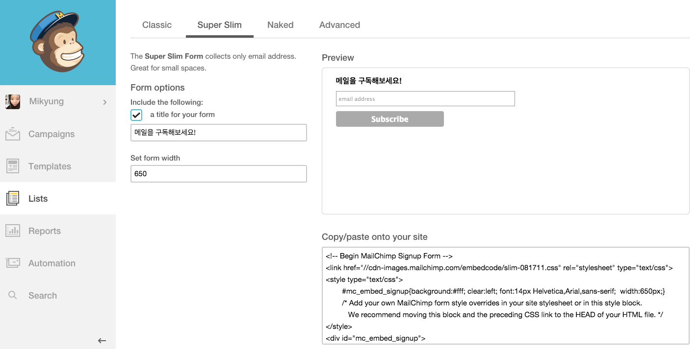 랜딩페이지에선 메일주소 수집하는게 유행이니까 (…) mailchimp도 붙여보자.List > Create List > Signup Form > Embeded Form 을 선택하면 뜨는 화면이다.