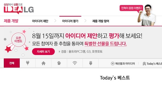 ‘아이디어LG’는 일반인 누구나 자유롭게 아이디어 제안, 평가, 제품화 과정에 참여하고 기여도에 따라 판매 수익을 나눠 갖는 제도다. 7월 14일부터 현재까지 아이디어 등록 수 약 1만 건, 참여자 수도 13만여 명을 넘어서는 등 소비자들로부터 큰 인기를 얻고 있다.