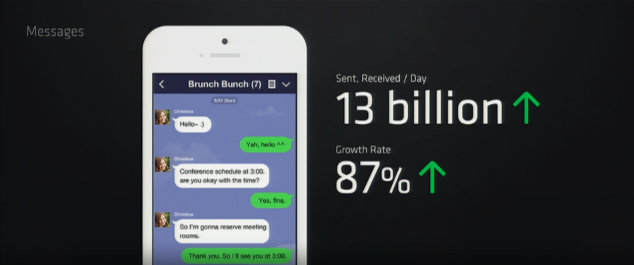이 정보는 등록 사용자수와 비교할 때 무척 민감할 수 있기 때문에 메세징 서비스들이 잘 공개하지 않는 데이터입니다. 하지만 라인 컨퍼런스에서는 CEO 가 직접 시원~하게 이 데이터를 공개해 주었습니다.