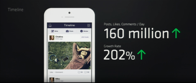 한국에서는 라인 사용자가 아직 많지 않아서 라인에 타임라인이 있는지도 모르는 분들이 많습니다만 타임라인에 업데이트(포스팅, 좋아요, 댓글 등)가 발생하는 횟수는 매일 1.6억 트랜잭션에 이른다고 합니다. 성장율이 202% 라는 점도 눈에 띄는 군요.