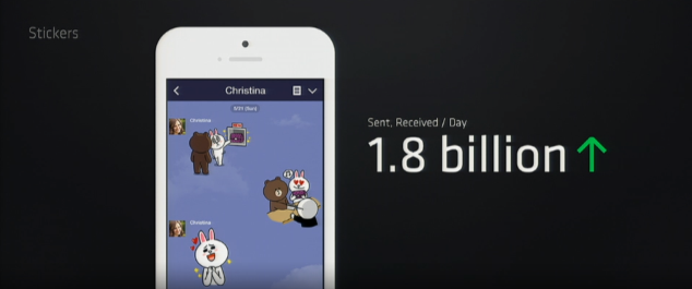 라인의 가장 큰 성장동력은 스티커(Sticker)입니다. 이를 의식한 듯 스티커에 대한 통계는 따로 공개를 했는데요, 매일 18억개의 스티커가 라인 사용자들 사이에서 전달되고 있다고 합니다. 개인적으로 알고 있는 라인의 지인들 -가족을 포함하여- 역시 스티커를 애용하고 있는 것을 보면 이해가 가는 숫자입니다. 라인은 스티커를 마켓플레이스처럼 만들어서 디자이너나 일러스트 작업을 하는 사람들이 마치 개발자들이 앱을 만들어 유료로 공급하는 것과 같은 생태계를 만들었습니다.