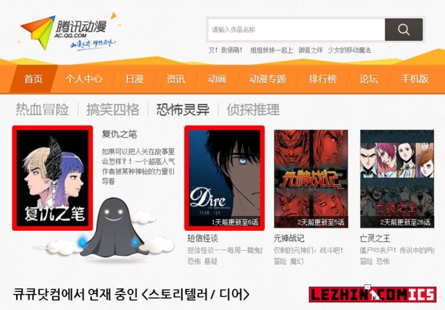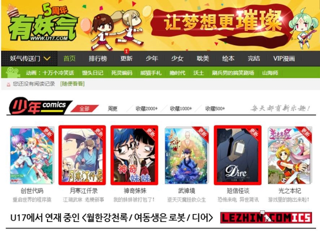 한국 웹툰 시장에 돌풍, 레진코믹스가 텐센트의 큐큐닷컴과 함께 중국 2위의 게임 기업 U17(유요치)에 16일부터 웹툰 연재를 시작했다. 연재 1차분은 총 9개 작품이며 추후 중국 최대 포털인 시나닷컴에서도 연재 예정이다.