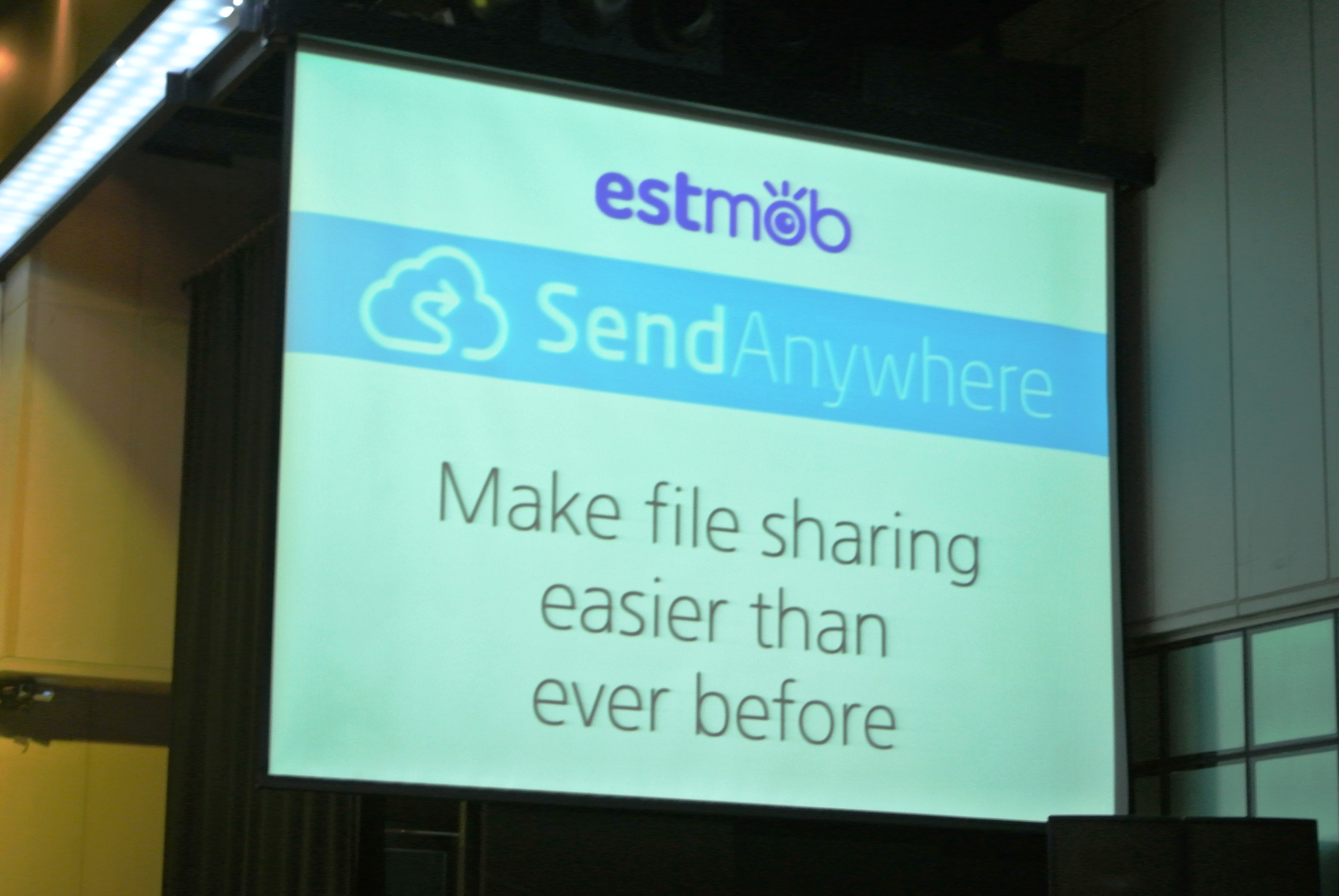 첫 번째 세션에서 3번 순서로 발표한 estmob팀의 샌드애니웨어(Sendanywhere, 대표 오윤식)는 별도의 로그인 절차 없이 일회용으로 발급되는 6자리 숫자로 이루어진 디지털 키를 이용, 스마트폰과 PC 등 기기간 손쉽게 파일을 공유할 수 있는 서비스를 선보였다.