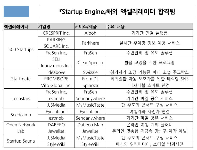 「Startup Engine」은 미래창조과학부와 정보통신산업진흥원(원장 박수용, 이하 NIPA)에서 해외 시장을 목표로 하는 국내 유망 기업이 글로벌 우수 엑셀러레이터에 합격 가능하도록 해외 엑셀러레이터와 공동으로 운영하는 pre-accelerating 프로그램이다.
