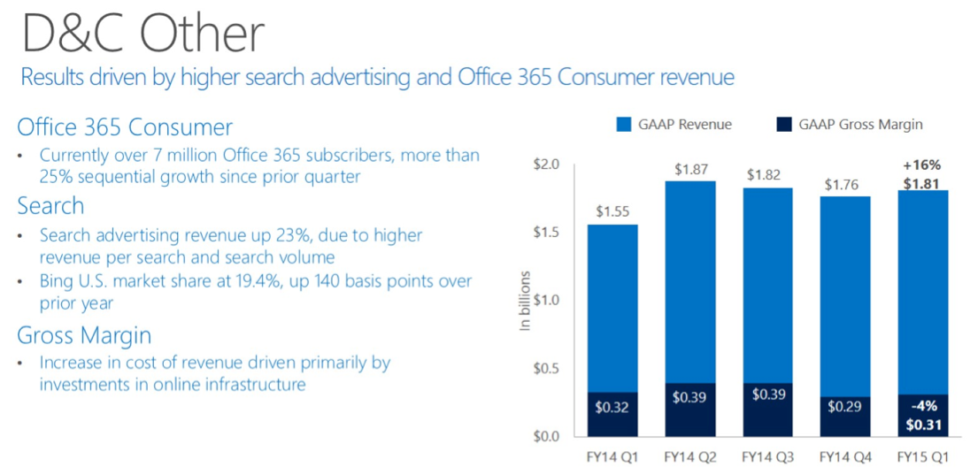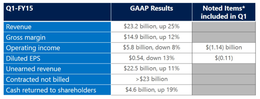 간밤에 마이크로소프트의 2015년 1분기 실적이 발표되었습니다. (마이크로소프트는 회계연도가 매년 7월부터 익년 6월까지이기 때문에 벌써 새로운 회계년도가 시작되어 1분기를 보냈습니다)