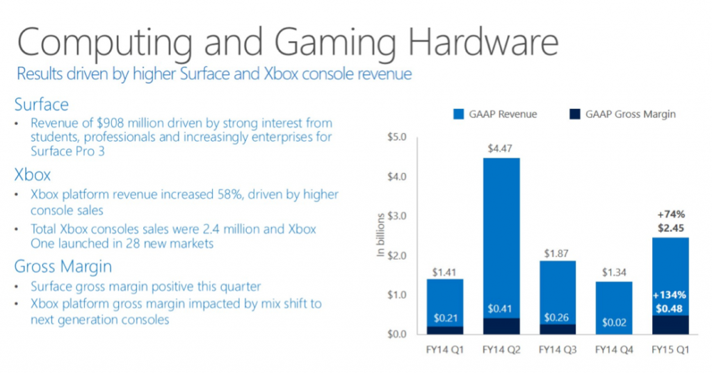 엑스박스 역시 높은 매출 신장을 보였는데요 그 증가폭은 무려 58%에 달합니다. 지난 분기동안 판매된 엑스박스 콘솔은 240만대이며 매출 및 판매량 증가에서 중요한 역할을 한 것은 28개국에 새롭게 진출하여 판매를 시작했기 때문이라고 합니다. 다만 전체 판매량에서 엑스박스 원(Xbox One)이 얼마나 차지했고 이로 인한 이익률이 얼마가 되는지는 공개되지 않았습니다. 여하튼 엑스박스 원과 서피스 프로3가 합작하여 하드웨어 부문에서 높은 성장률을 만들어 냈다는 점이 핵심인 것 같습니다. 역시 마이크로소프트는 하드웨어의 강자인 것일까요? ㅎㅎ