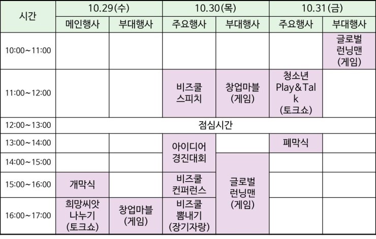 ** (글로벌 런닝맨) 국내외 학생 2인으로 구성된 팀이 기업가정신이나 창업과 관련된 단계별 임무를 완수하면 알파벳 카드를 제공받고, 이 카드로 BIZCOOL 단어를 가정 먼저 완성한 팀이 우승하는 방식의 게임