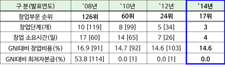 세계은행(World bank)이 매년 발표하는 기업환경평가(Doing Business 2015)에 의하면 우리나라의 창업부문순위가 17위로 지난해 34위에서 17계단 상승했다고 합니다.