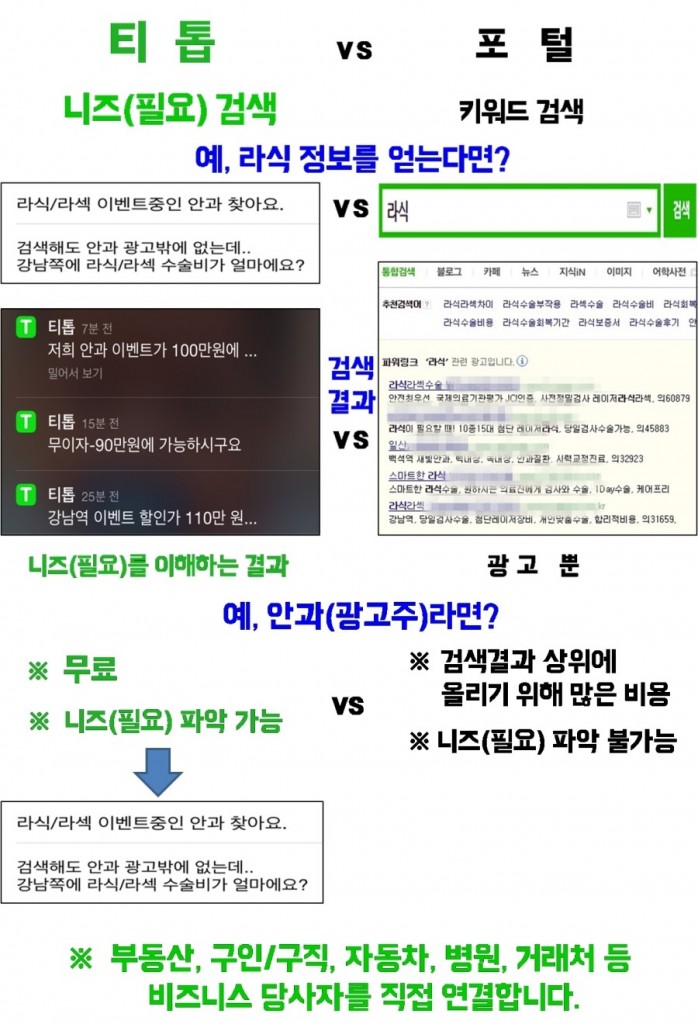 반면 티톱은 사용자의 ‘필요’를 검색한다. “라식 수술비 얼마에요?” 라고 쓰면 근처의 안과와 연결돼 견적을 받을 수 있다. 안과(광고주)는 포털에 ‘검색광고’ 할 필요 없이 무료로 “라식 수술비 얼마에요?” 라는 내용을 받을 수 있다.