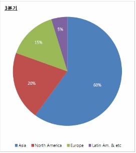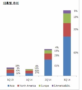 아시아가 60%로 뻥~터집니다. 물론 비율만 높아진 게 아니라, 절대적인 매출 수준도 어마무시하게 올라갔죠.