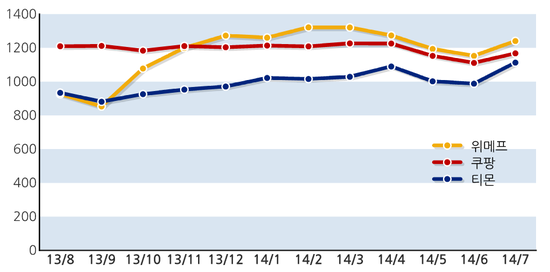 그러던 2013년 갑자기 판도를 바꾼 사업자가 있으니 바로 위메프입니다. 위메프는 2010년 티몬, 쿠팡과 비슷한 시기에 사업을 시작했고 초기에는 나름 두각을 나타냈지만 2011년 마케팅 전쟁에서 손을 떼면서 존재감이 사라졌죠.
