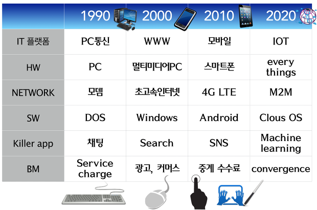 IT 플랫폼은 10년마다 하드웨어, 소프트웨어, 네트워크의 기술적 도약과 함께 변화한다. 1990년대에 386 컴퓨터, MS-DOS, 다이얼업 모뎀과 함께 열린 PC통신은 2000년대에 강력한 성능의 멀티미디어 PC, Windows, 초고속 인터넷으로의 기술 도약과 함께 웹으로 패러다임이 전환했다. 이후 2010년경 스마트폰, Android(iOS), 4G LTE의 개막과 함께 모바일 시대가 시작되었다. 이렇게 3가지의 IT 플랫폼을 구성하는 기술들이 변화하면서 IT 플랫폼도 큰 전환점을 맞이한다.