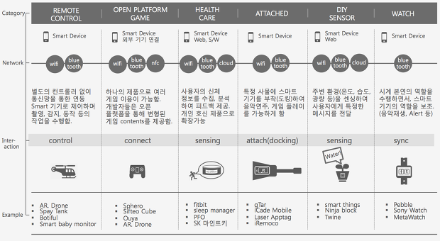 삼성전자와 같은 기존 전자기기 제조업체에서는 스마트폰 이후 사물 인터넷 시대를 맞이해 손목에 차는 스마트와치, 밴드 그리고 기존 가전기기를 인터넷에 연결시키는 홈 네트워크 등을 준비하는데 여념이 없다. 퀄컴, 인텔 등에서는 사물 인터넷 전용 칩셋, 반도체 개발에 주력 중이며, 통신사는 블루투스나 WiFi, NFC 등을 넘어 사물간 통신을 위한 새로운 네트워크를 준비하고 있다. 이 와중에 작은 스타트업들의 도전도 다양해지고 있다. 킥스타터에는 새로운 아이디어의 사물 인터넷 기기들이 넘쳐나고 있다.(http://goo.gl/sZz1XK) 나이키, 필립스, Mattel, LEGO, 하기스, 월마트 등의 IT와 무관한 기업들도 사물 인터넷 기반의 기술을 이용해 혁신적인 사업 아이템과 신규 비즈니스 모델을 만드는데 주력 중이다.