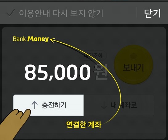 살짝 과정이 복잡하지만, 이 시련을 지나고, 이후 앱 내에 큼지막하게 배치된 충전하기 버튼을 누르면! 뱅크월렛카카오에 현금이 충전돼 ‘뱅크머니’를 사용할 수 있는 상태가 됩니다. (여기까지 오기 참 힘들었다 ㅜㅜ)