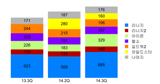 리니지 685억원, 리니지2 148억원, 아이온 329억원, 블레이드앤소울 198억원, 길드워2 197억원, 와일드스타 160억원, 기타가 176억원을 기록했습니다.