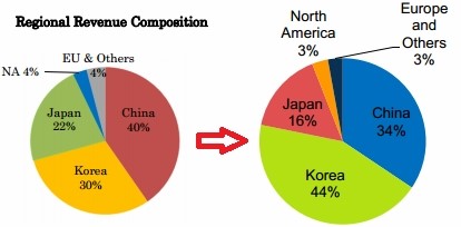한국이 무려 44%의 매출 비중을 기록했습니다. 지난해에는 중국이 40%, 한국이 30%를 차지했는데요, 1년 만에 한국이 44%로 늘었고, 반면 중국은 40%에서 34%로 감소했습니다.