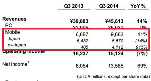 긍정적인 부분을 먼저 찾아보면 아직은 전체의 21%에 불과하지만 모바일 분야의 약진이 눈에 띄는데요. 일본 모바일게임 매출이 하락했지만, 한국 등 해외 매출이 늘며 지난해보다 무려 41% 상승했습니다.