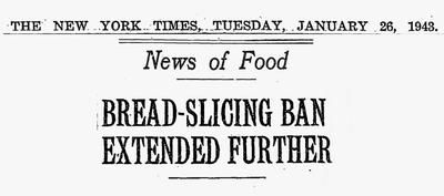 슬라이드 식빵이 주방과 제과점을 점령해가던 1903년대를 지나 1943년이 되어 세계 2차 대전이 발발하자 미국정부는 자원절약 차원에서 슬라이드 식빵 판매를 금지시킵니다. 슬라이스 식빵이 통으로 된 식빵보다 포장에 종이도 많이들고 제조과정에서 효율성이 떨어뜨린다는 것이죠. 그런데 3개월이 지나고 주부들과 제조사들의 항의와 불만에 판매금지를 포기합니다. 생각보다 자원절약이 별로 안되더라는 궁색한 변명을 늘어놓으면서요.