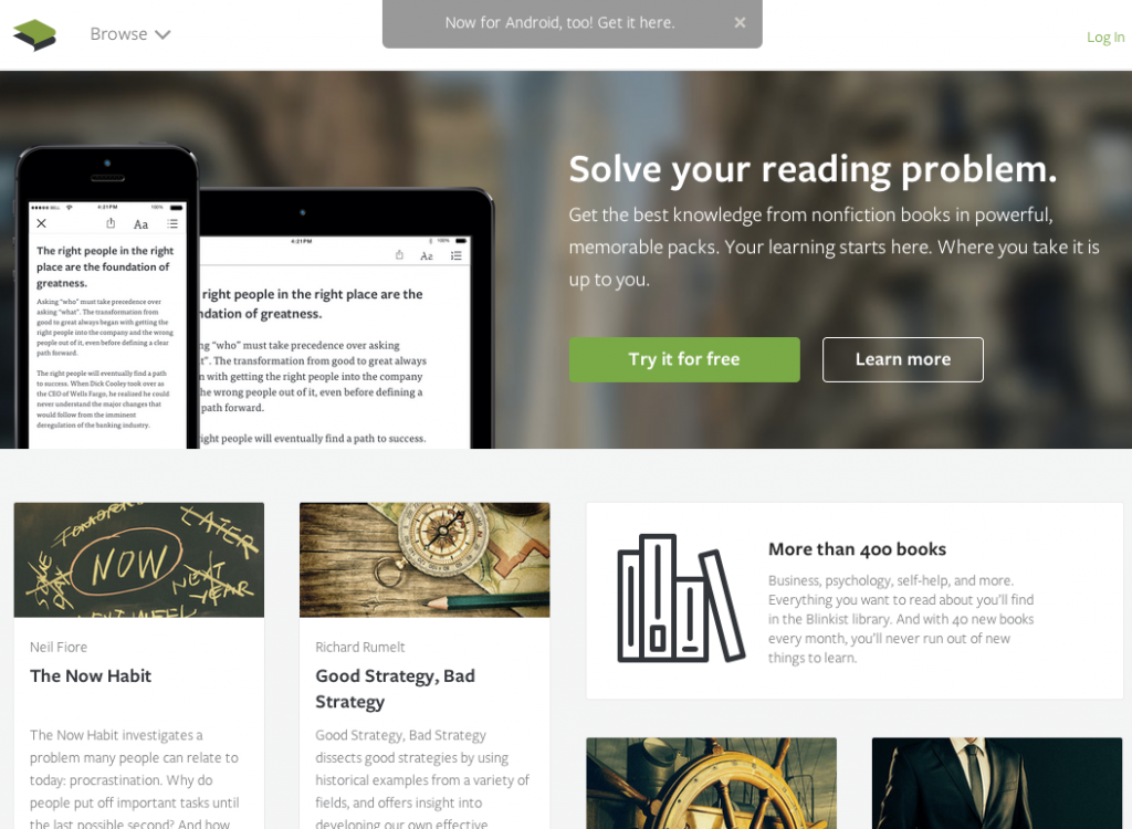 책읽을 시간이 없는 사람들을 위해서 좋은 책을 골라 몇장의 카드로 요약 서비스를 해주는 Blinkist.